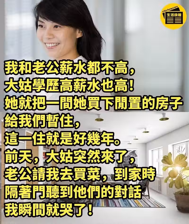 我和老公薪水都不高,大姑學歷高薪水也高!她就把一間她買下閒置的房子給我們暫住,這一住就是好幾年。前天,大姑突然來了,老公請我去買菜,到家時「隔著門聽到他們的對話」我瞬間就哭了