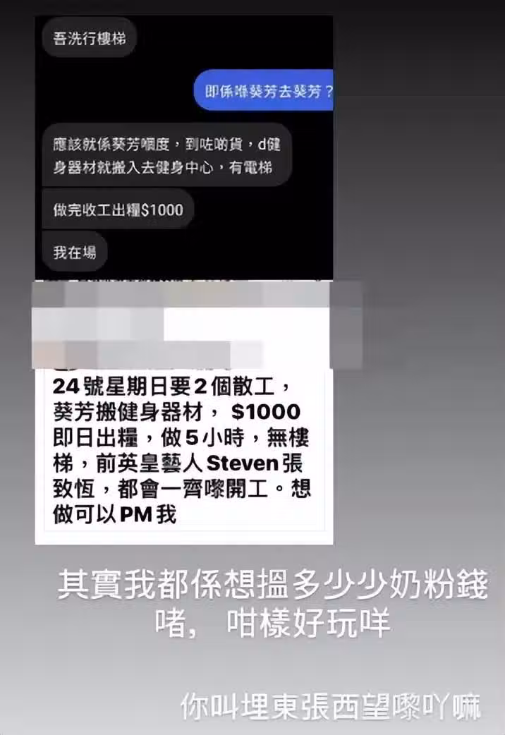 (14日)張致恆在限時動態中分享了一張Fb群組「香港突發事故報料區」的帖文截圖及他與僱主的對話,當中就見到該僱主在Fb群組發布招聘啟事,並留言列出工作內容及招聘詳情:「24號星期日要2個散工,葵芳搬健身器材,$1000即日出糧,做5小時,無樓梯,前英皇藝人Steven張致恆,都會一起來開工。想做可以PM我。」