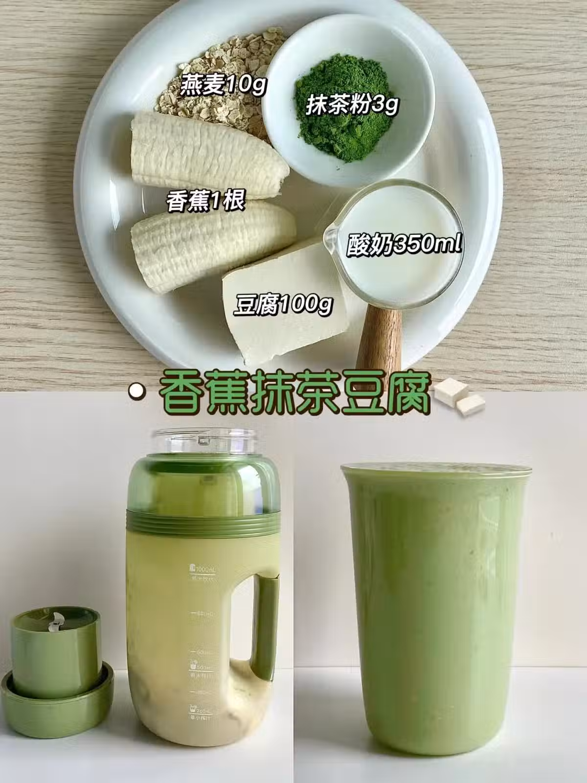 即食燕麥10g+抹茶3g+豆腐100g+香蕉1根+酸奶350ml