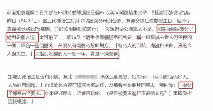 說實話,誰看到一個女明星如此發文痛斥一個富豪,都會往一些「花邊」八卦上想,但比起其他女明星炮轟一個有錢男人,這次袁嘉敏同時罵了父子倆人,著實是令人有些意外。