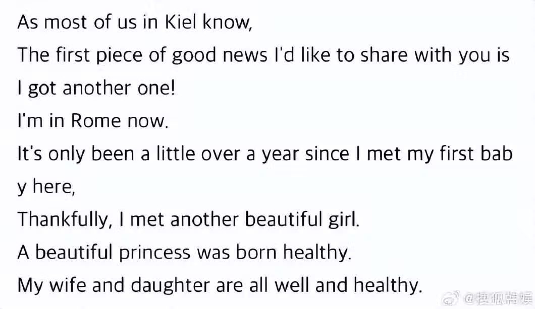 宋仲基在個人粉絲網站發文,向粉絲透露一個好消息,他在羅馬得到了另外一個孩子,一年多前,在羅馬第一次見到自己的兒子,幸運的是,在這裡再次遇到一個漂亮的女孩,健康美麗的公主,母女平安。