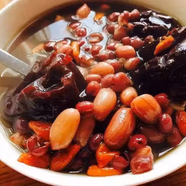 花生味甘、性平,益氣健脾。而花生衣則有止血又補血的雙重功效,能抑制纖維蛋白的溶解,增加血小板的含量和改善血小板的品質,同時還能促進骨髓造血機能。所以,煲五紅湯時,最好選擇深紅色的帶皮花生仁。