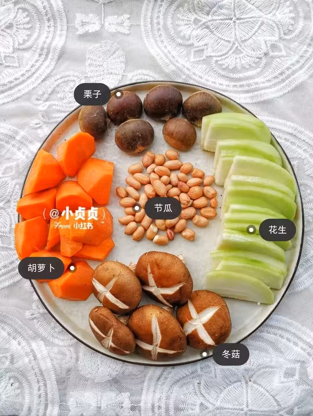 節瓜1個,紅蘿蔔1個,栗子100g,冬菇5個,花生50g