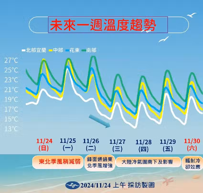 根據ETtoday報導,周三到周五將會是最冷的時候,北部及東半部溫度會比現在降低8到10度,目前預估最冷恐只剩9度左右,這波冷空氣達到大陸冷氣團等級,若再增強不排除成為寒流,早晚因為輻射冷卻體感溫度會更低,中南部日夜溫差也會相當的大。