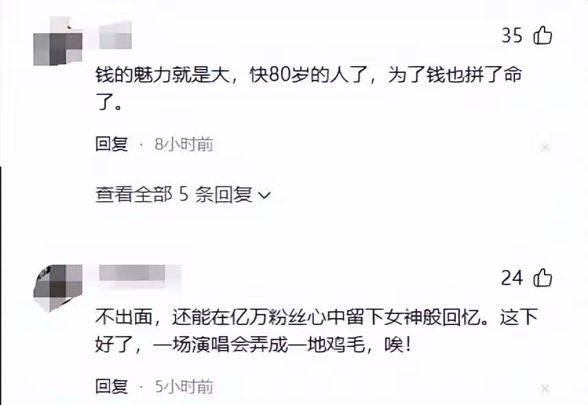 只是沒想到,汪明荃精心準備的個人演唱會,觀眾卻不怎麼「買帳」,還有人調侃:快80歲了還出來撈金?也太拼了吧。