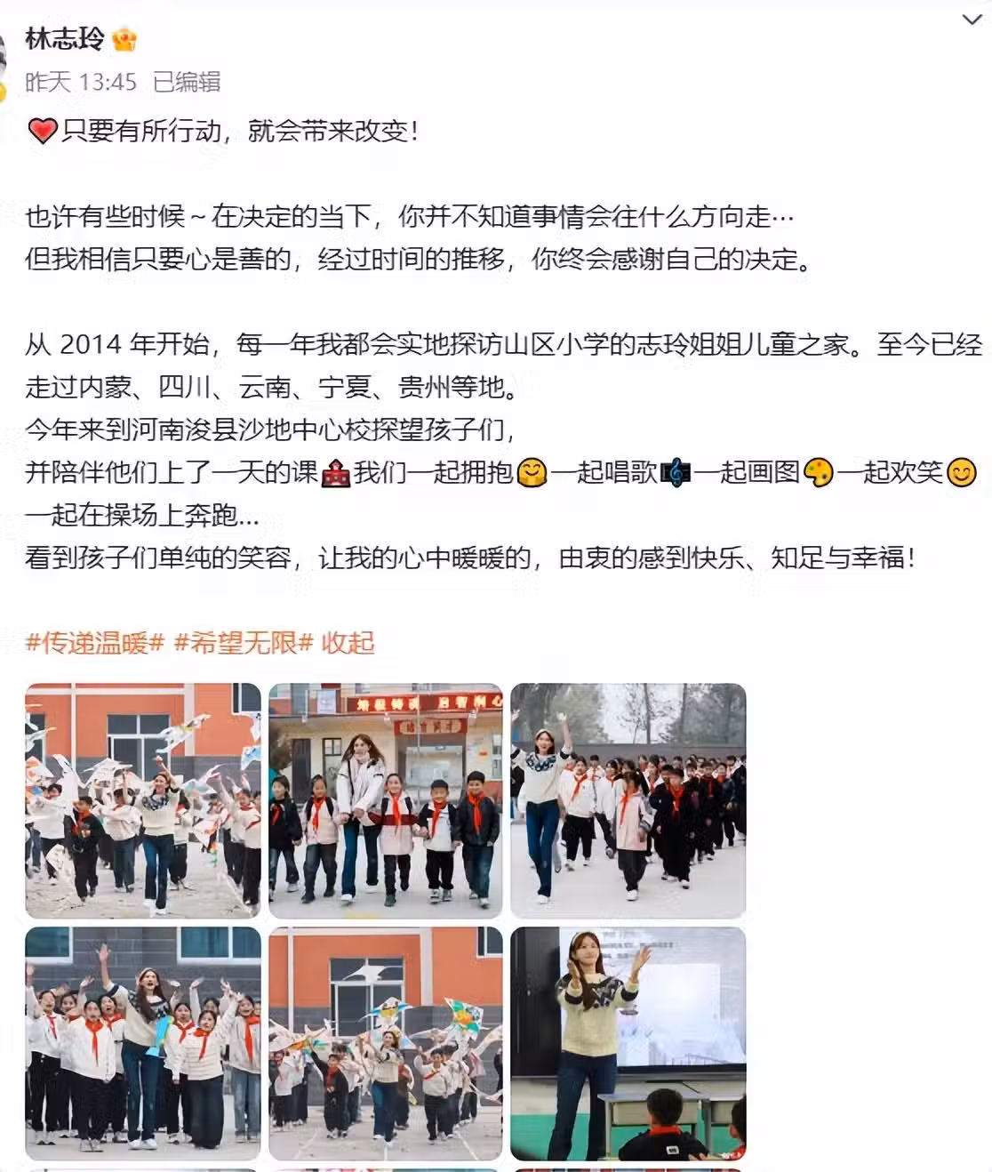 大家都知道古天樂在內地捐建了很多學校,他本人一直不願公開。沒想到林志玲也是如此,她從2014年開始捐建「兒童之家」,至今在內蒙、四川、雲南等地建了二十所「兒童之家」,為鄉村的孩童提供住宿條件和學習環境。林志玲坦言曾陪著一個大涼山女孩走了3小時的山路,體會到求學之路的艱辛,正如她在文中所言「做個可以照亮自己照亮別人的女人」。