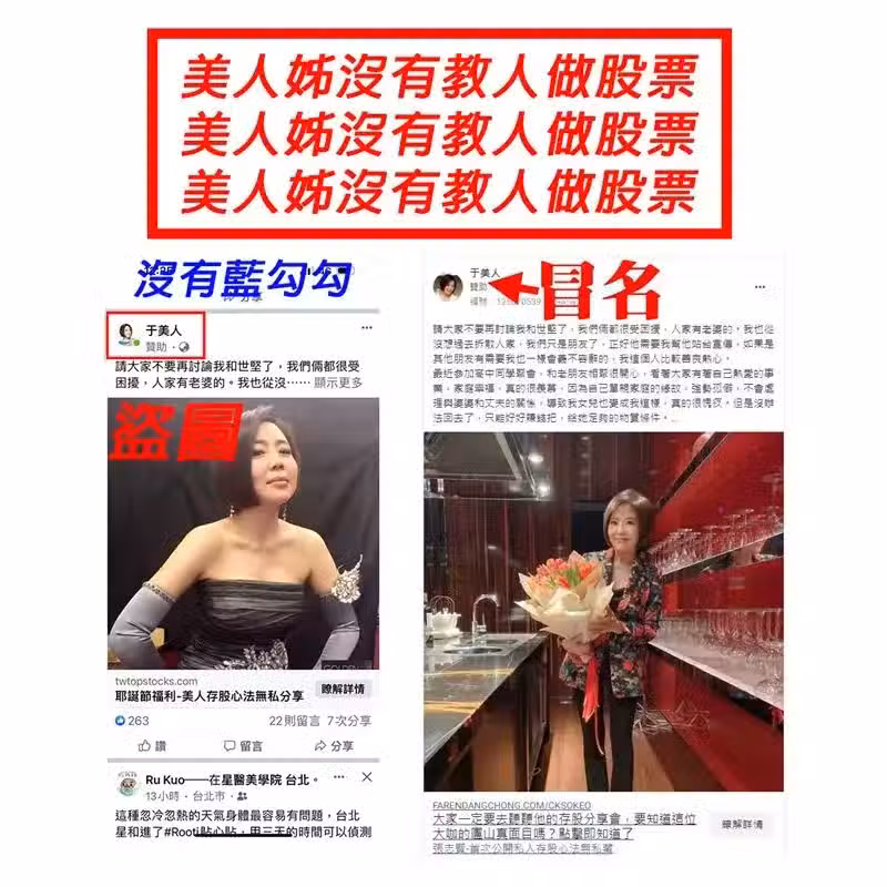 于美人日前透過小編在臉書一連發了兩篇文,一開頭就重複3次寫道:「美人姊沒有教人做股票。