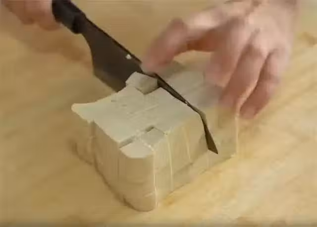 2.一塊錢的老豆腐先切片切條,再切成小方塊。