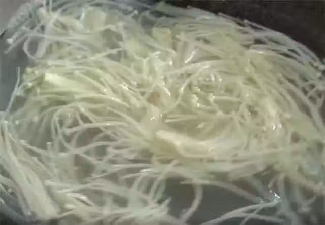 7.鍋里水燒開放一勺鹽,下入處理好的金針菇焯水一分鐘,去一下草酸和異味,撈出來過一下涼開水。