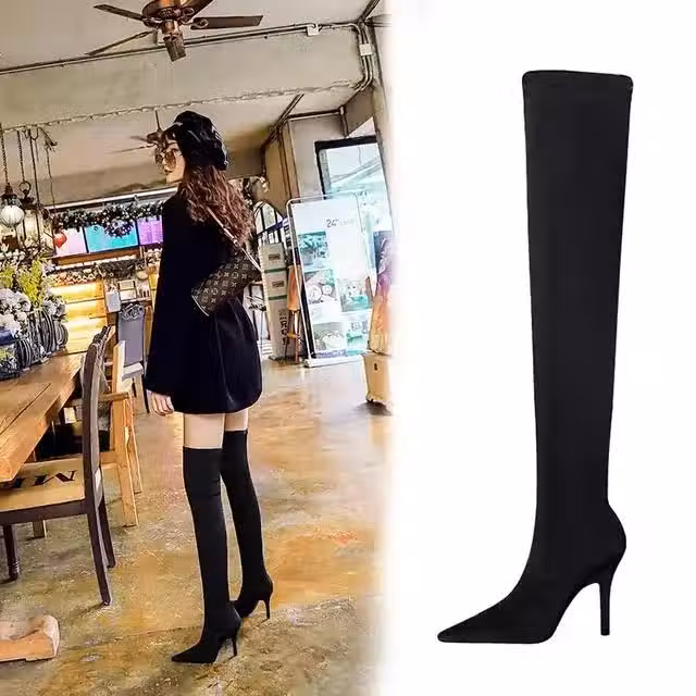 除此之外,考慮到中年女性對於高跟鞋的駕馭難度,建議大家儘量選擇略微帶跟的平底長筒靴,如圖下所示↓,而不是那種尖頭細高跟的長筒靴。