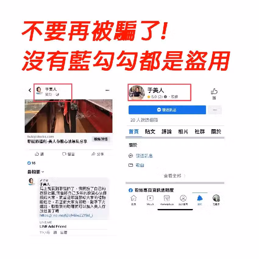 臉書小編也進一步呼籲大家,有「藍勾勾」的才是正港的美人姊粉專,若有看到其他假的,請一律檢舉並封鎖對方。