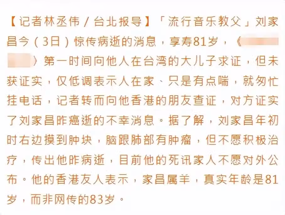 台媒詢問劉家昌長子,對方僅表示人在家、只是有點喘,便匆匆掛斷電話。記者聯繫劉家昌在香港的朋友,朋友確認劉家昌於12月2日晚上病逝,透露劉家昌年初時摸到腫塊,腦跟肺部有腫瘤,因為不願積極接受治療病逝,家人則不願對外公布死訊。