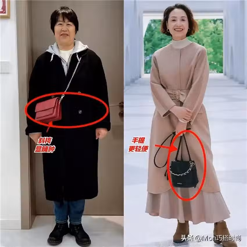 想像一下,厚重的外套搭配一個斜挎的小包,很容易加劇上半身的臃腫感,顯得虎背熊腰的!