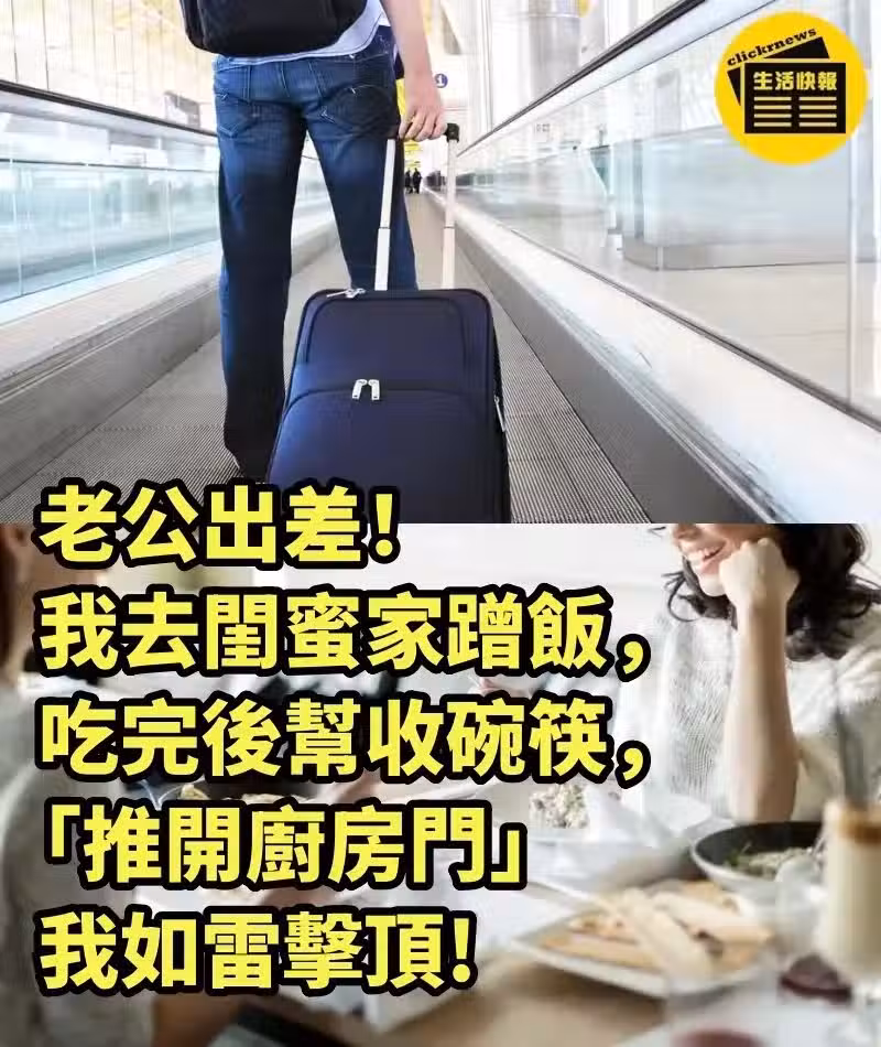 老公出差,我去閨蜜家蹭飯,吃完後幫收碗筷,「推開廚房門」我如雷擊頂