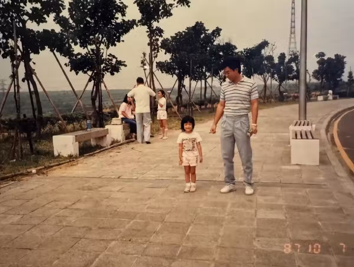 這張照片是陳妍希4歲的時候,一家人去海邊玩耍,小小的陳妍希跟在爸爸身邊,軟萌又可愛。
