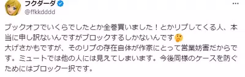 《漫畫家フクダーダ》批評讀者買二手書還特地告訴他,這種妨礙生意的留言都直接封鎖