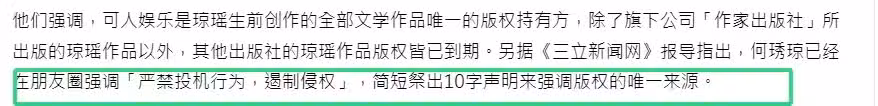 隨後,瓊瑤的兒媳何琇瓊在朋友圈用10個字回應這場風波,話里話外指的便是平鑫濤的幾個子女:嚴禁投機行為,遏制侵權。