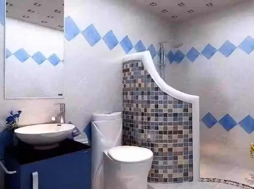 如果你覺得另一種浴簾的方法不好的話,還可以嘗試這種半牆隔斷的設計,用磚砌一道半人高的擋水牆就可以了,