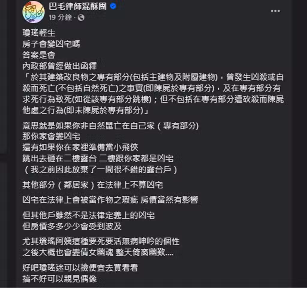 10日,陳安宇律師拿出對凶宅的解釋聲稱,曾經發生兇殺或者是自殺等事實的房子,都將被歸類於凶宅行列。