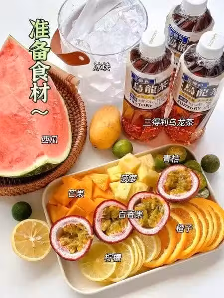 🍉西瓜、🥭芒果、🍍菠蘿、百香果、青桔、🍋檸檬、🍊橙子、🧊冰塊、🍃三得利烏龍茶