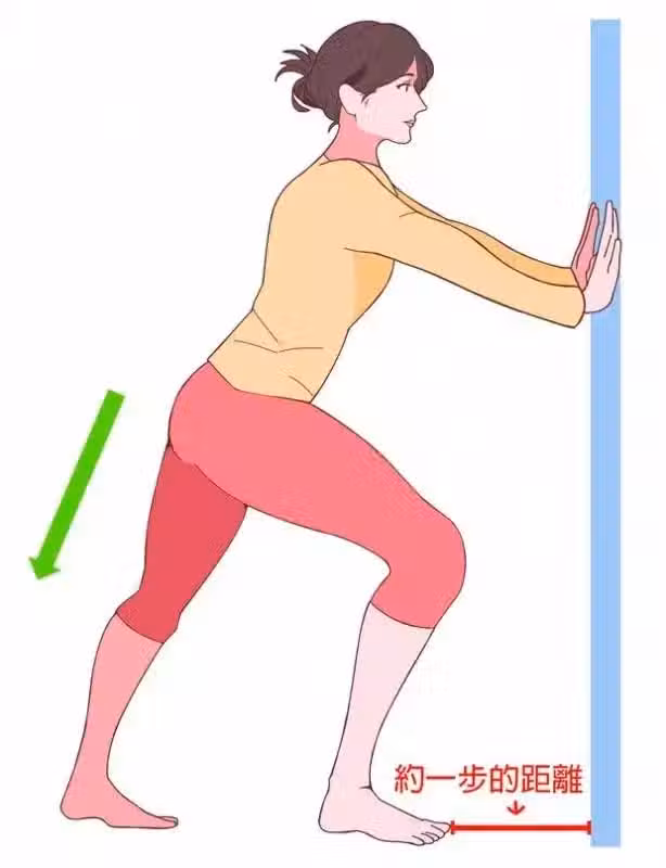 小腿肌肉是造成腳跟疼痛的主因之一,小腿肌耐力升高可增強跖腱膜的張力。首先,站在距離牆邊一步的地方,雙手扶牆,將要伸展的腿向後延伸,保持腳後跟貼地,前腳膝蓋彎曲,保持15-20秒的伸展,兩隻腳各重複4次。