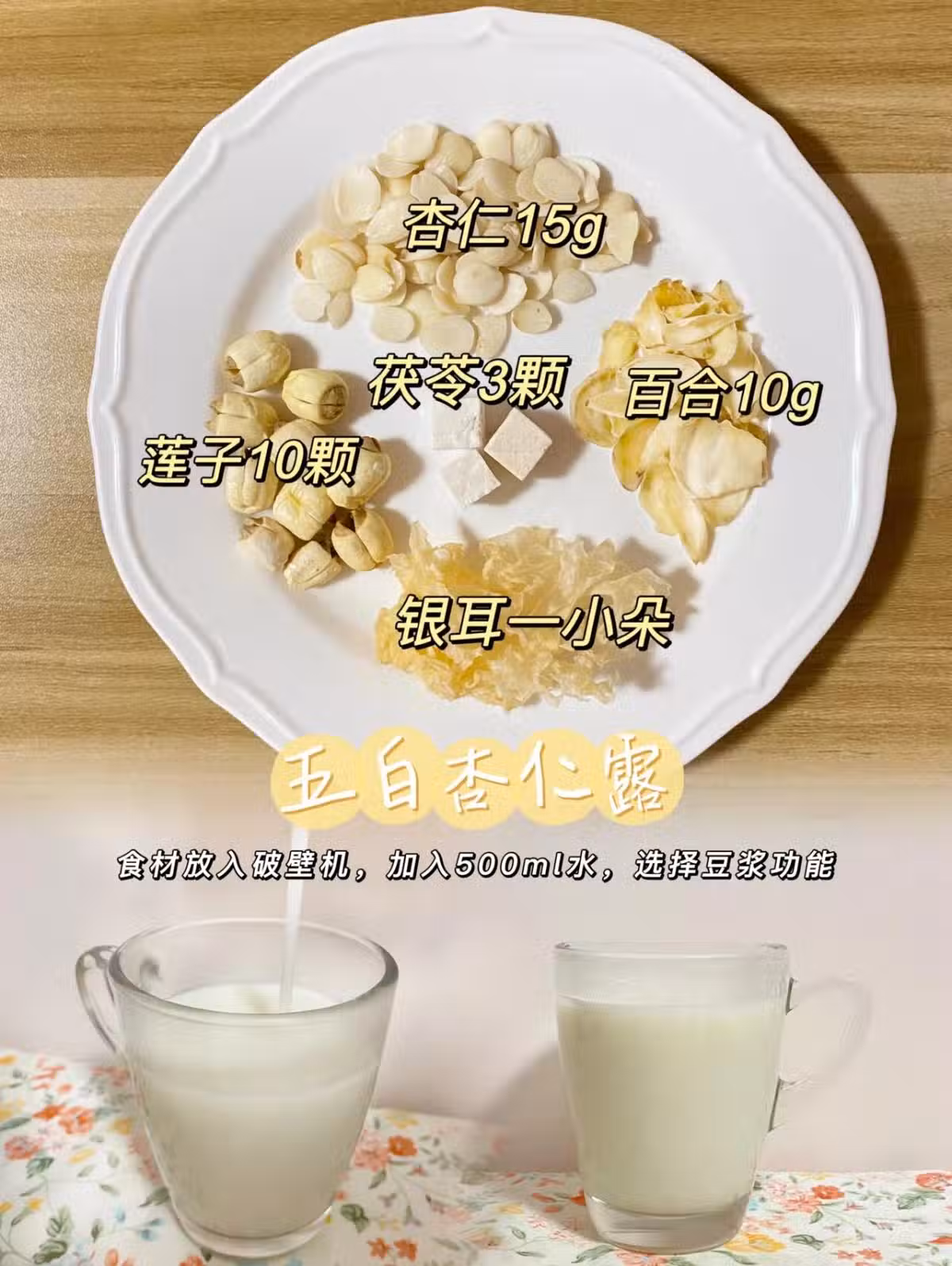 南杏仁15g、百合10g、蓮子10顆、茯苓3顆、銀耳一小朵+500ml清水