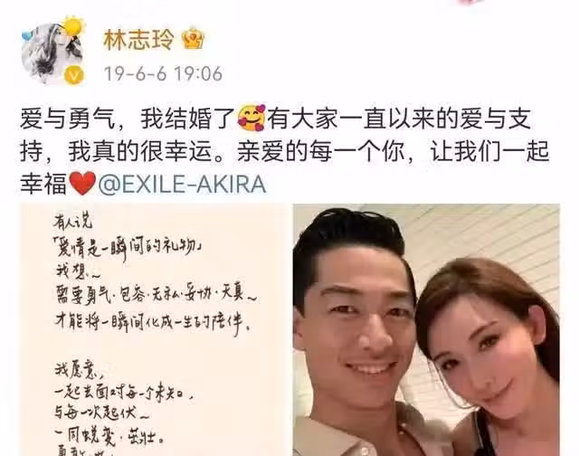 等到2019年6月6日,林志玲官宣結婚的時候,外界都在感嘆,45歲的林志玲可以嫁富豪,可以嫁小開,卻偏偏追尋內心對愛的執著,找到了一生中的最愛——普通的日本男演員黑澤良平。