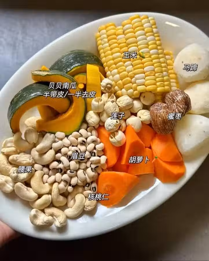 馬蹄/眉豆/蓮子/腰果/玉米/南瓜/胡蘿蔔/蜜棗