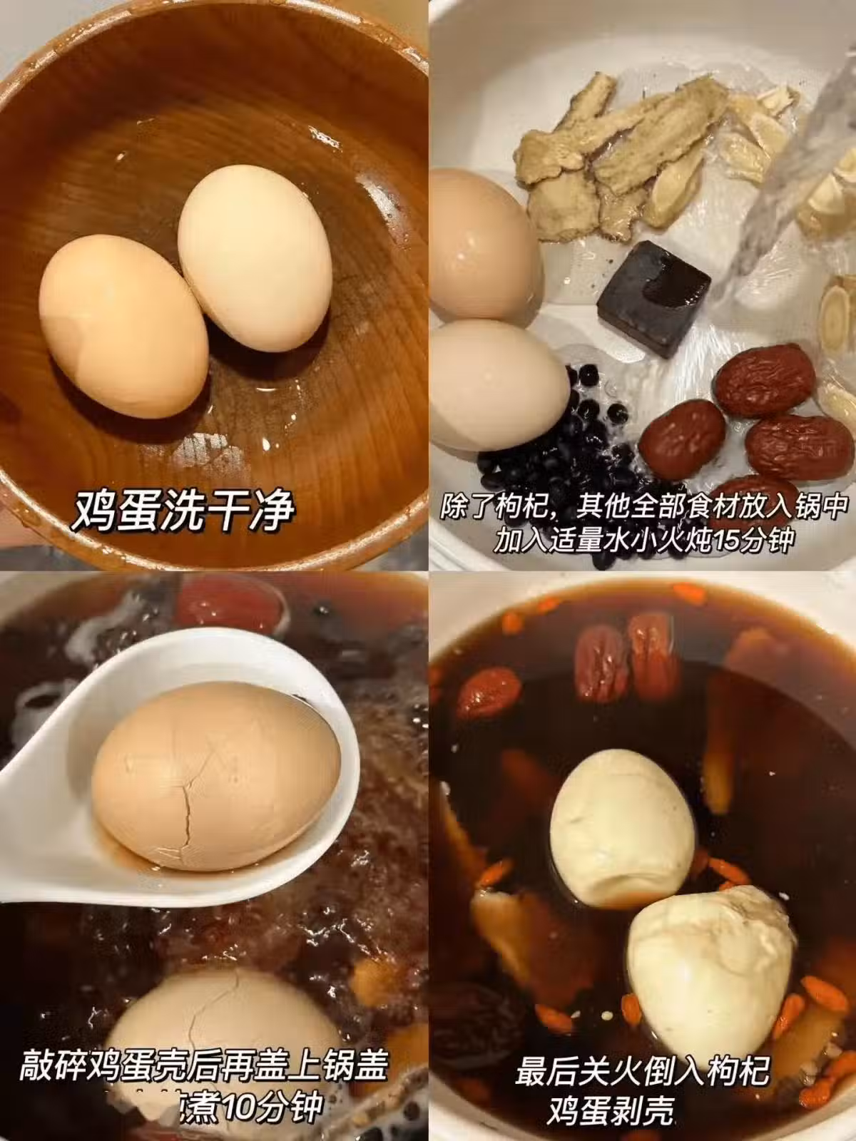 開始是直接將雞蛋放進去煮的,在湯汁裡面煮熟之後才剝殼,這樣是最好的我老媽說!