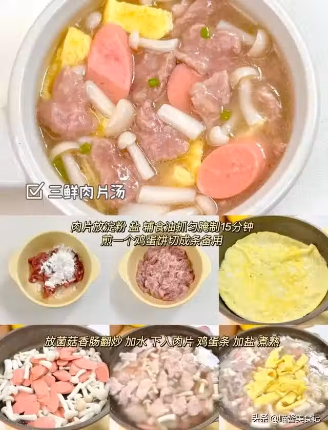 這道三鮮肉片湯製作簡單,口感清新,湯汁鮮美。三鮮肉片、蔬菜和菇類的相互搭配,讓獨特的味覺和滋味浸潤在舌尖,美味可口,營養豐富。推薦大家在家中親自動手做一次,與家人朋友分享此美味佳肴,一定會受到大家的喜愛!