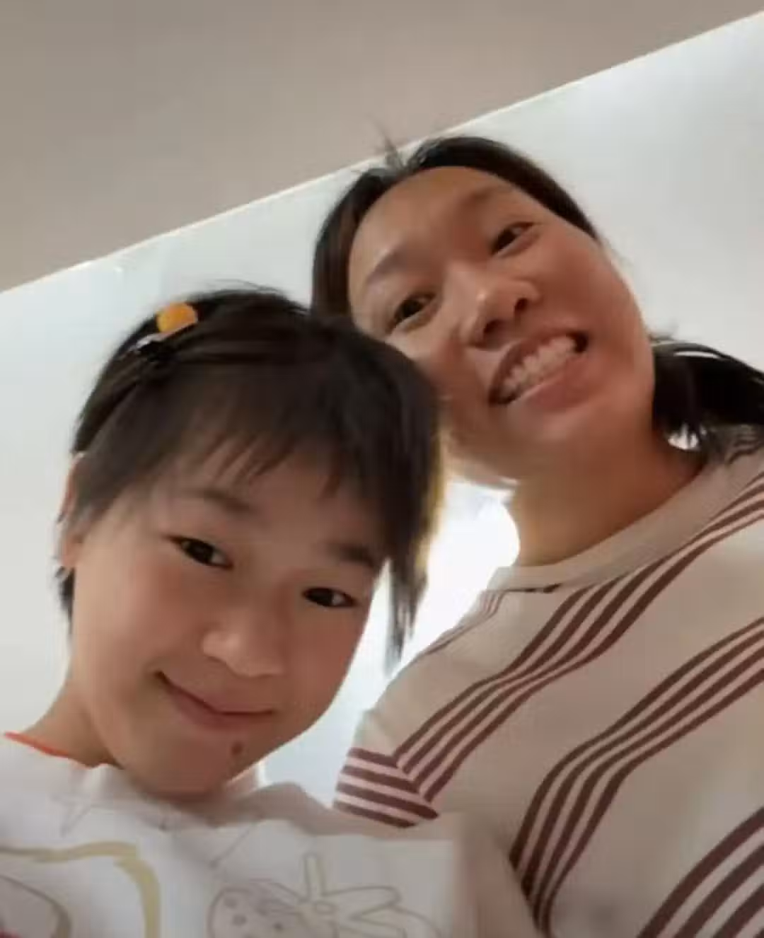 全紅嬋身穿白色羽絨服,對著發光公仔拍不停,寶寶穿寶寶的衣服