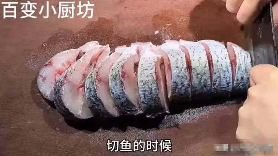 然後再把魚分切成小塊,為了每一塊魚大小都差不多,我們可以先在魚的表面划上花刀,全部這樣做好。