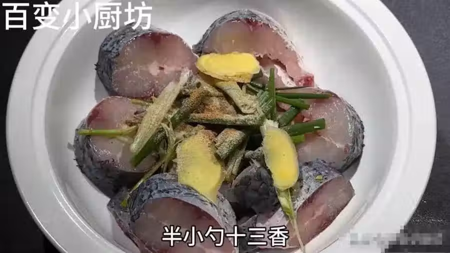三根小香蔥,把蔥白醋用刀拍一拍,拍碎了之後再切成長段,蔥白處比較堅硬,這樣拍碎之後更利於裡面的味道被充分的釋放出來,放進魚盆里,然後再準備一塊生薑,切成薄片。也放進魚盆里。