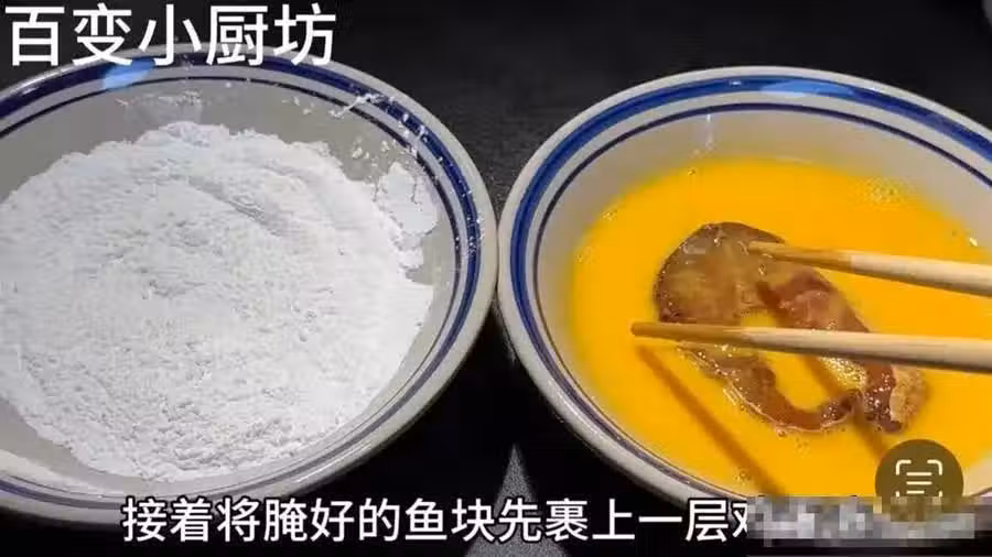 接著將腌好的魚塊先裹上一層雞蛋液,再裹上一層我們調好的粉。一面裹好後,我們將裡面的魚塊再翻一個面,每一個面都要均勻的裹上一層粉,裹好後用筷子夾起來,將上面多餘的麵粉抖乾淨,像這樣就可以了。