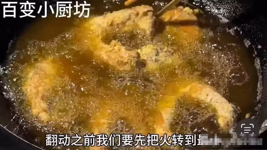 這個時候魚塊已經完全定型,我們就要用筷子來翻動一下了。
