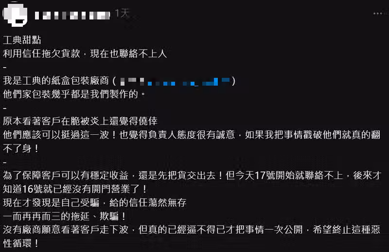 「工典甜點」前段時間因「千層蛋糕只有五層」廣告圖文不符的問題而慘遭炎上,消費者掀起退貨潮,後來也有包裝廠商發文po出對話截圖爆料,指10月就開始要求匯出帳款,但到了11月底仍有仍有8月至11月近33萬元的欠款未償還,到了12月僅結清8月的款項,氣得廠商怒批「給的信任蕩然無存,一而再再而三的拖延、欺騙」。