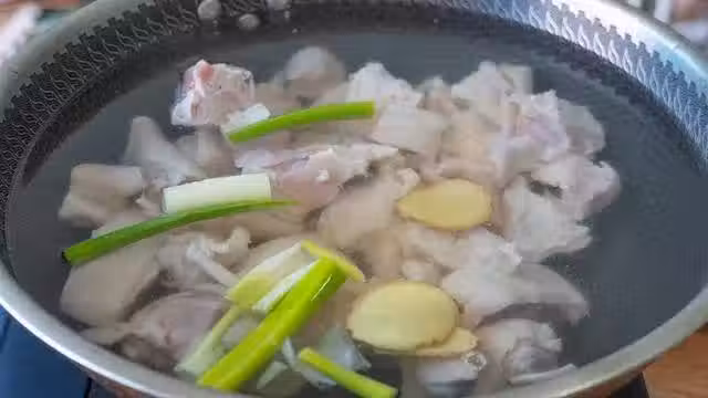2、起鍋燒水,冷水倒入豬腳焯水,加大蔥、薑片、料酒去腥,中火煮開後撇去浮沫。豬腳的味道還是比較重的,所以焯水去腥這一步還是很關鍵的。