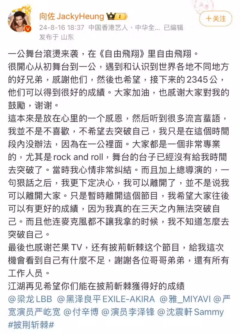 向佐回應退賽《披哥4》真正原因!一個手指就能整一個節目的流量