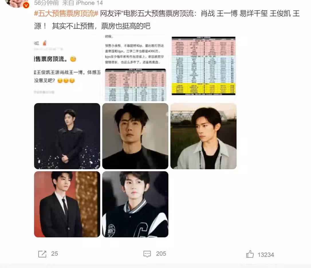 甚至還有營銷號總結了「五大預售票房頂流」,分別為肖戰、王一博、易烊千璽、王俊凱和王源。後面還加了句「其實不止預售,票房也挺高的吧。」