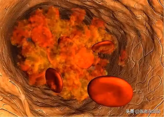 長期的高脂血症導致血液粘稠度增加,流速減慢,過多的血脂逐漸沉積在動脈內膜下,形成斑塊。