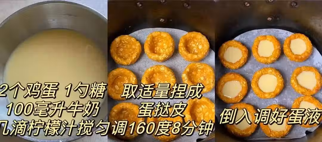 4.取大概30g左右的紅薯麵糰捏成蛋撻皮,再把調好的蛋液倒進去,注意,蛋液不要倒太滿,裝一半就好,避免漏出來
