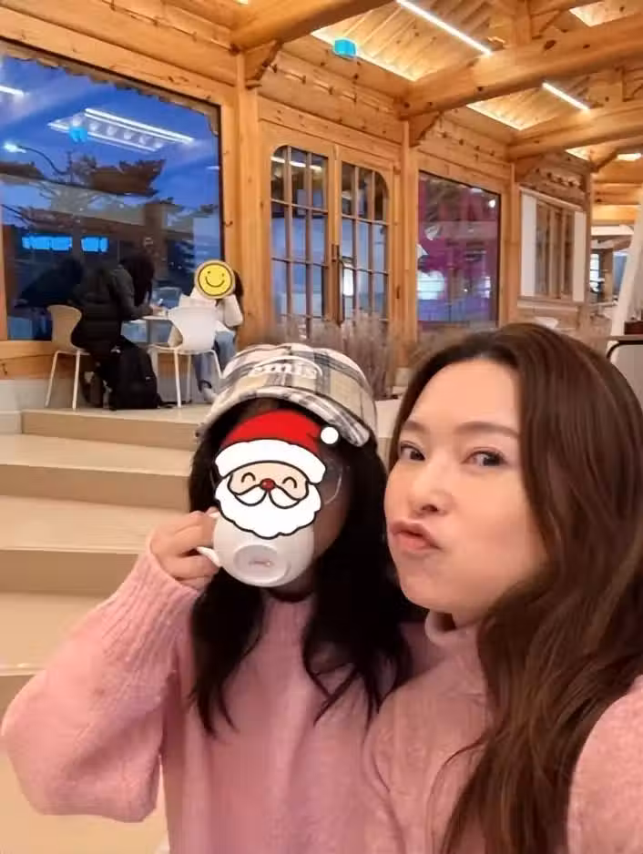 歐倩怡早於暑假時,已帶女兒到韓國旅行,今次出遊未有透露地點,但從歐倩怡打卡的照片背景看來,似乎是再度的韓國旅行。兩母女穿上同一粉紅色系毛衣,坐在韓屋裝潢的餐廳內,女兒雖然被遮臉,但見到戴上眼鏡的她正在喝東西,被媽媽抓住自拍。