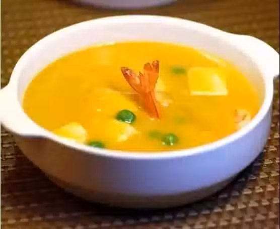 6.把嫩豆腐切小塊放進鍋里,再放入青豆和腌好的明蝦。