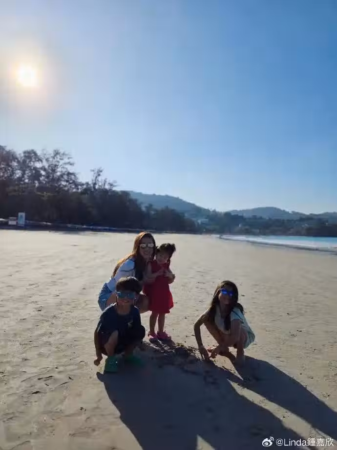 畫面一轉,鍾嘉欣老公掌鏡拍下了多張愛妻和三個兒女的溫馨合影,每一幀都充滿幸福與溫情。下圖裡,鍾嘉欣蹲在海灘上陪三個寶貝玩兒沙子,母子母女四人都看著老公的鏡頭,雖然是背光的視角,但鍾嘉欣和孩子們臉上的燦笑還是一覽無餘,真的好幸福啊。