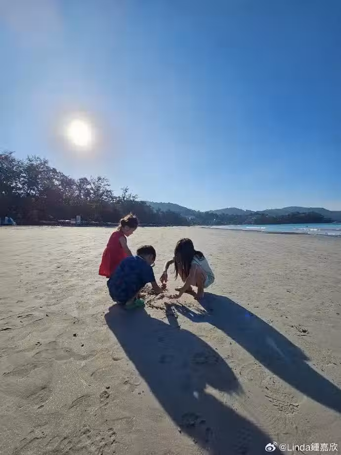 鍾嘉欣老公記錄下三個寶貝兒女在海灘上玩耍的一幕,配上周遭的碧海藍天,確實是唯美極了。