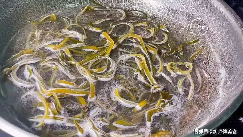 第二步:將海帶切成筷子細的條狀,然後鍋中放入適量的水,大火將水煮開後,接著將海帶放入到鍋中,焯水2分鐘就可以撈出。