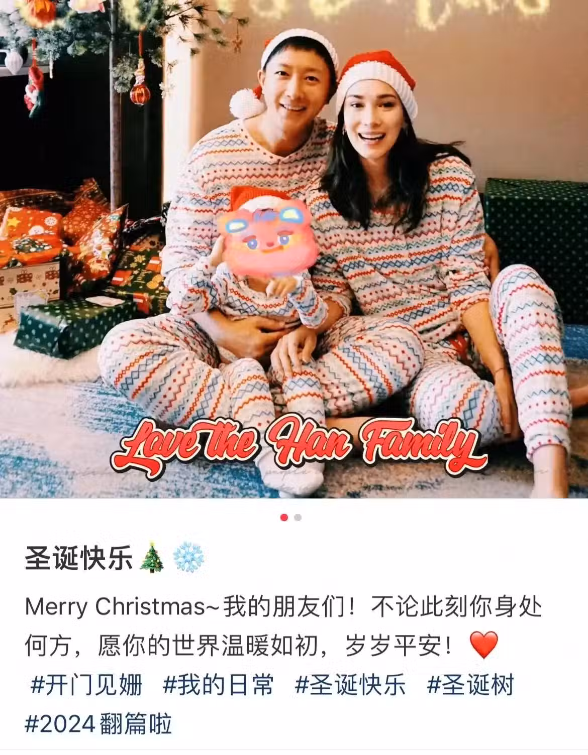 12月25日,盧靖姍在社交平台曬出聖誕節全家福,女兒罕見出鏡,好有愛。盧靖姍配文「聖誕快樂,Merry Christmas,我的朋友們!不論此刻你身處何方,願你的世界溫暖如初,歲歲平安!」