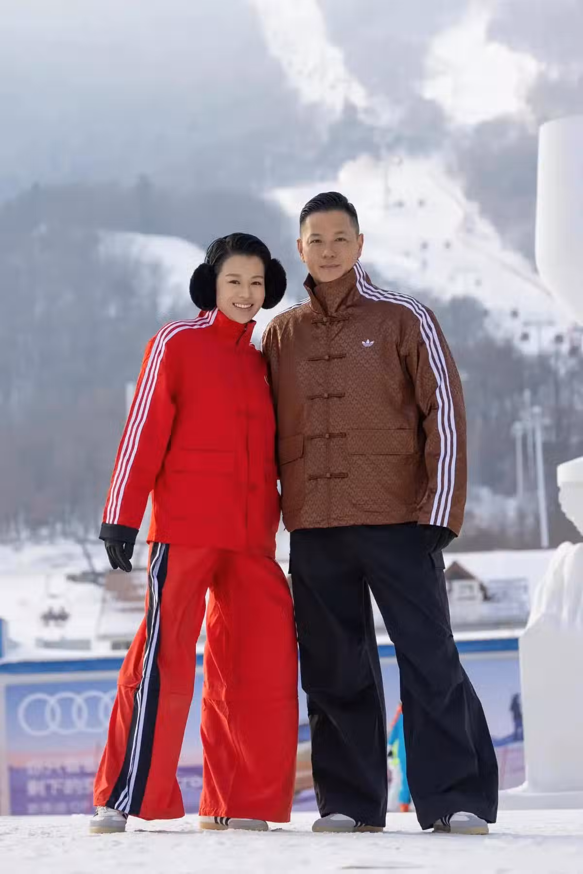照片中,胡杏兒身穿紅色套裝,老公李乘德身穿棕色外套和黑色長褲,夫婦倆穿著同款不同顏色造型組情侶裝,男帥女美,個子高挑,真的好般配呀。