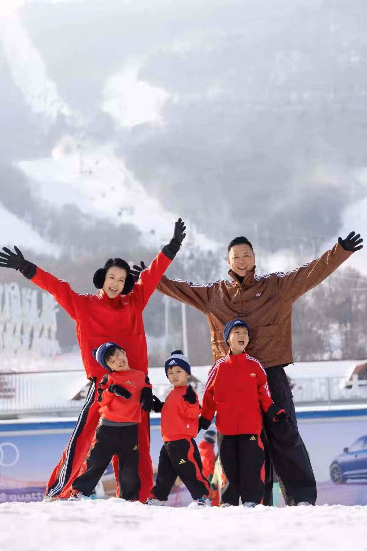 胡杏兒和老公帶三個兒子去吉林滑雪,一家五口在雪地玩耍,好歡樂