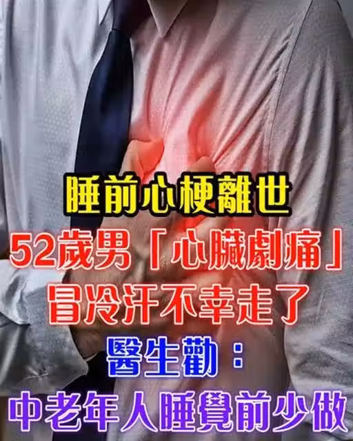 睡前心梗離世!52歲男「心臟劇痛」冒冷汗不幸走了 醫生勸:中老年人睡覺前少做